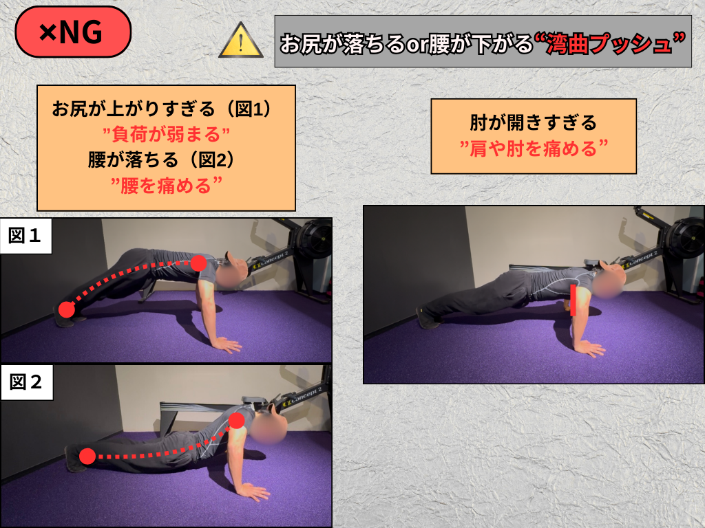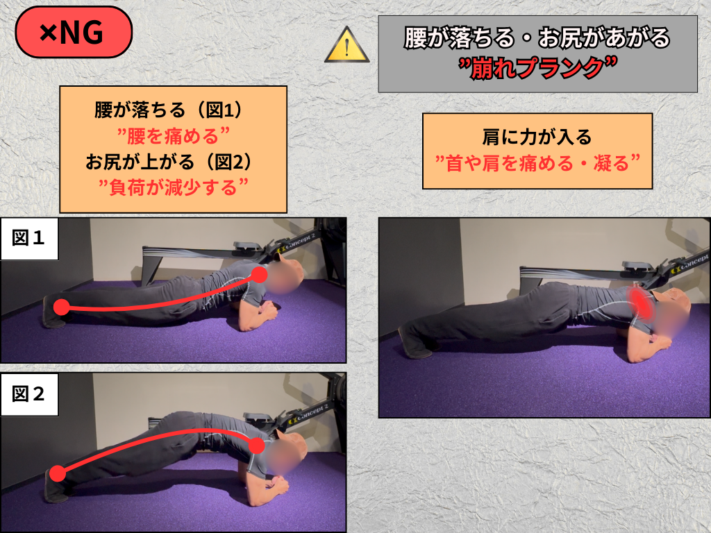 • お尻を浮かせ、頭からかかとまでを一直線に保つ