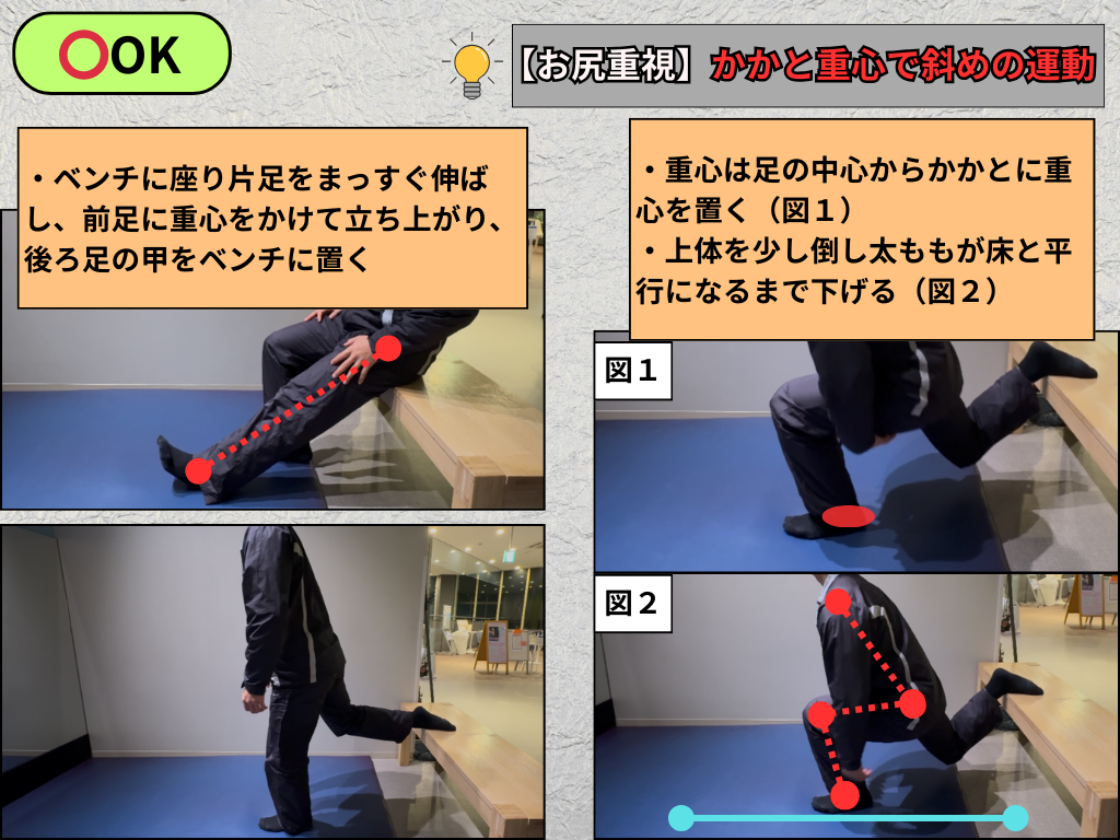 • 動作【お尻重視】上体をさげたときに、膝の角度が90度になるようにお尻を斜め後ろに引きながら下ろし、斜め前に立ち上がる