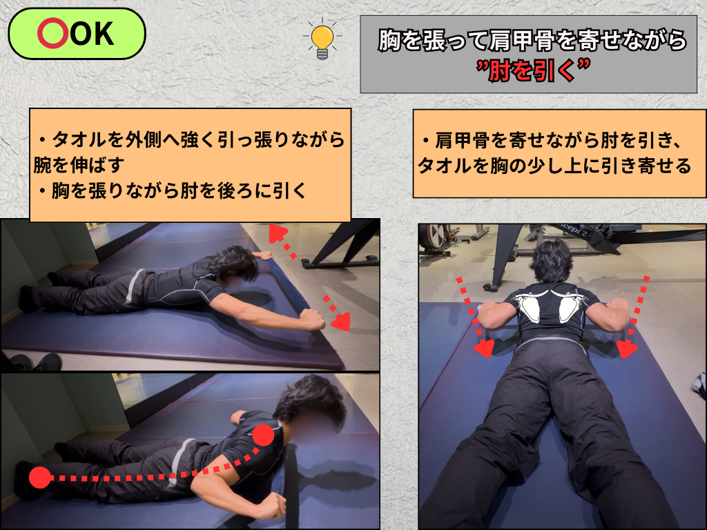 • 肘を後ろに引く意識で、肩甲骨を寄せながらタオルを胸の少し上に引き寄せる