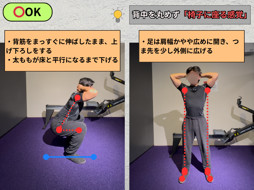 ✔ 深くしゃがめなくてOK(太ももが床と平行くらいまで)
